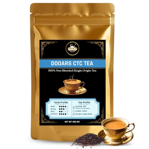 Disfruta de una taza de té CTC con sabor intenso y malteado, ideal para preparar chai o té con leche. Este té se mezcla perfectamente con leche y azúcar, creando una bebida rica y reconfortante que es parte de la vida diaria en muchos hogares alrededor del mundo. Nuestras hojas de té son cuidadosamente seleccionadas de reconocidos jardines en la región de Dooars, famosa por su suelo fértil y clima único. Estas condiciones producen un té con un sabor distintivo y cuerpo completo. El té negro CTC es naturalmente rico en antioxidantes, que ayudan a proteger el cuerpo del estrés oxidativo y a mantener la salud general. Añade este delicioso té a tu rutina diaria y disfruta de una experiencia revitalizante y llena de sabor.