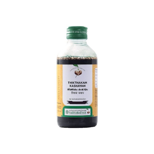 Tiktakam Kashayam es una decocción herbal diseñada para apoyar la salud de la piel. Está formulada con una mezcla de hierbas poderosas que desintoxican el cuerpo, alivian las irritaciones de la piel y mejoran la cicatrización de heridas. Este producto restaura eficazmente la salud de la piel y alivia las molestias asociadas con diversas condiciones cutáneas.